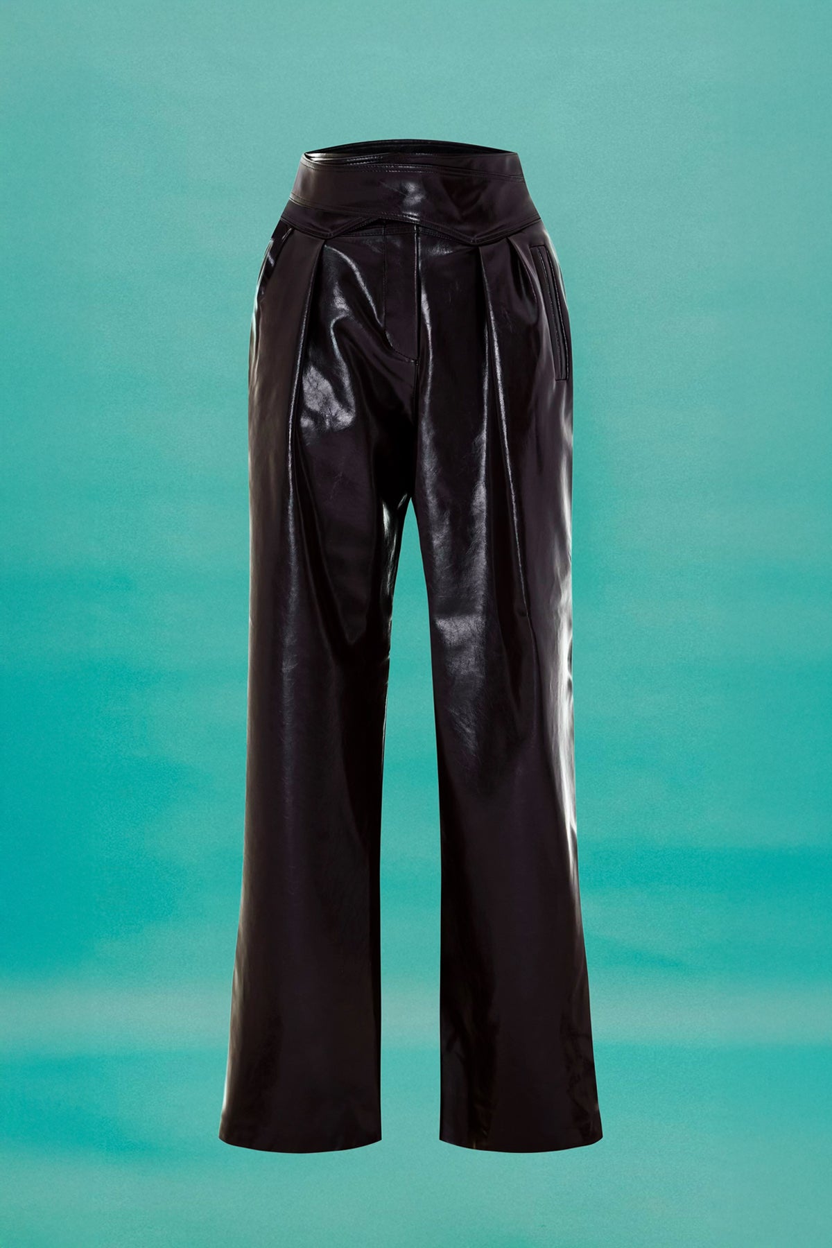 Modern zarafetin cesur bir yansıması. Yüksek bel deri pantolon, parlak yüzeyi ve kemer detaylarıyla güçlü bir duruş sergiliyor. Klasik ve avangard stilin mükemmel birleşimi. • Parlak suni deri