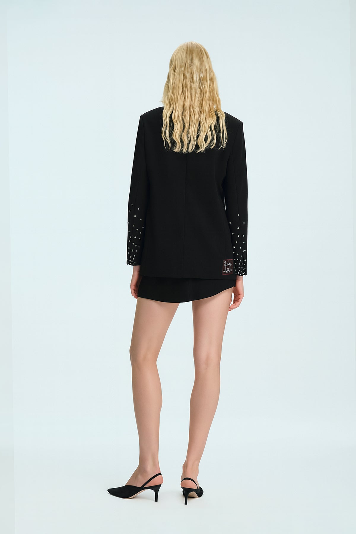 Combining a minimalist silhouette with beaded embroidery, this black blazer is a modern reflection of timeless elegance. It makes a strong statement for everyday wear or evening occasions. • Beaded sleeve details