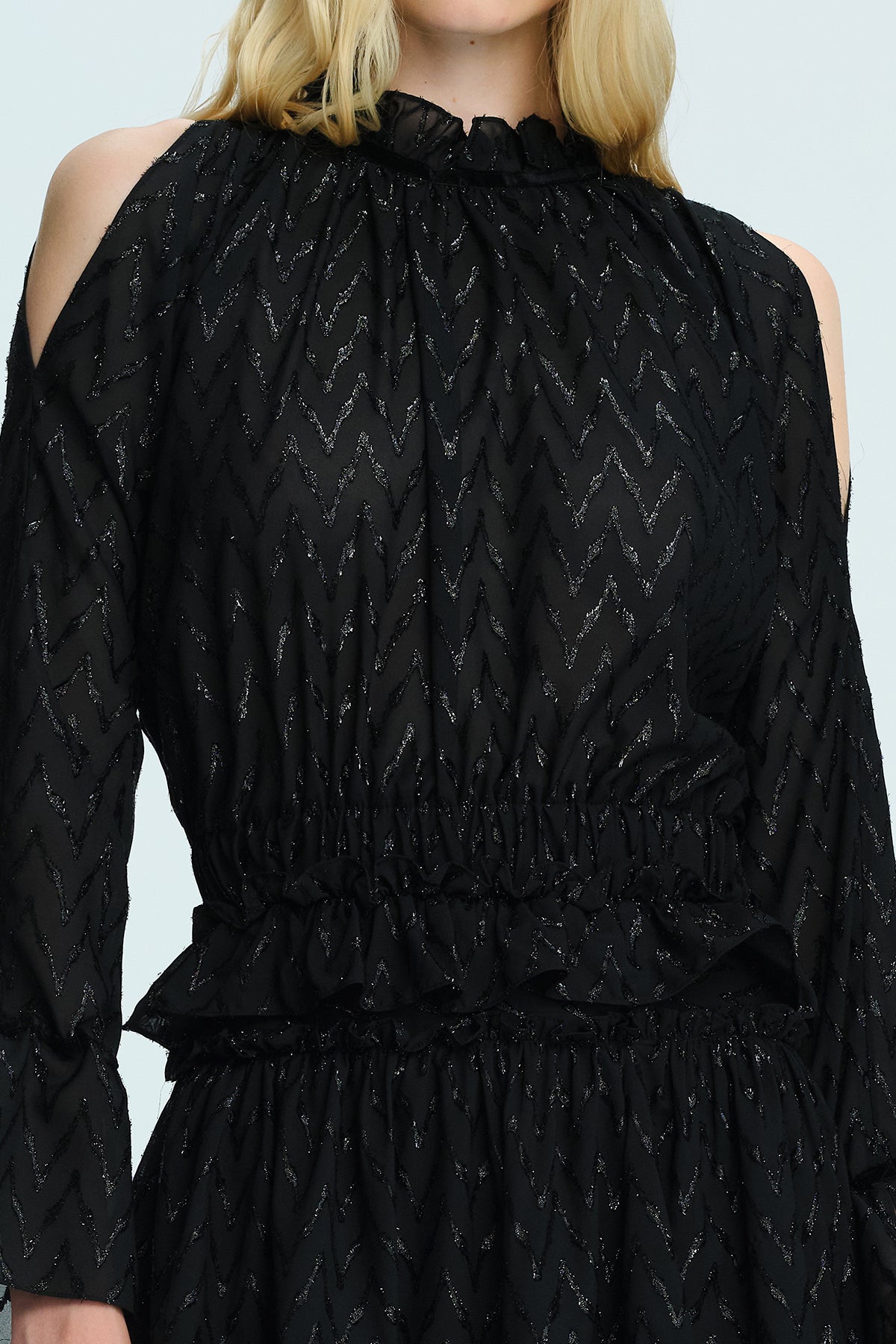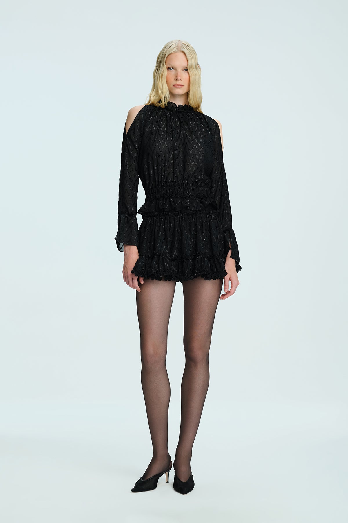 This mini dress, combining romantic details with a modern silhouette, offers elegant movement with ruffle details and off-the-shoulder necklines. Its finely textured fabric and pleated waist create a subtle, feminine feel while adding volume. It's the ideal choice for a glamorous look on any occasion, from everyday elegance to special occasions. • Long sleeves and off-the-shoulder design