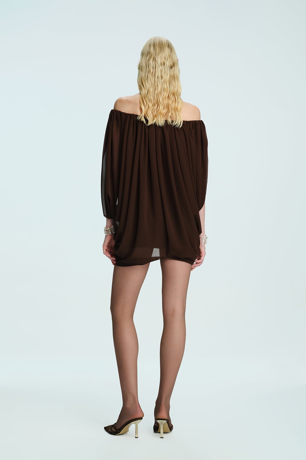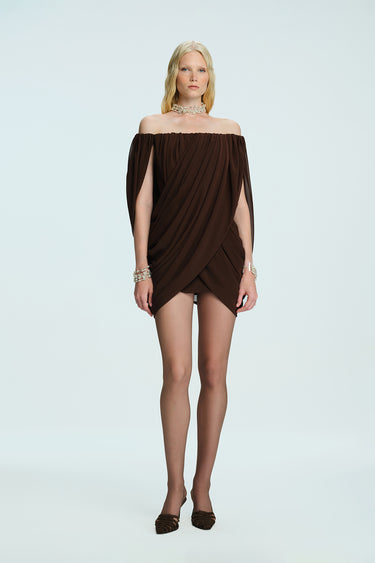 Offering timeless elegance with a modern touch, this off-the-shoulder mini dress creates a romantic look with its flowing shape and elegant fabric. Its fluid shape creates a graceful rhythm as you move. • Off-the-shoulder, draped shape