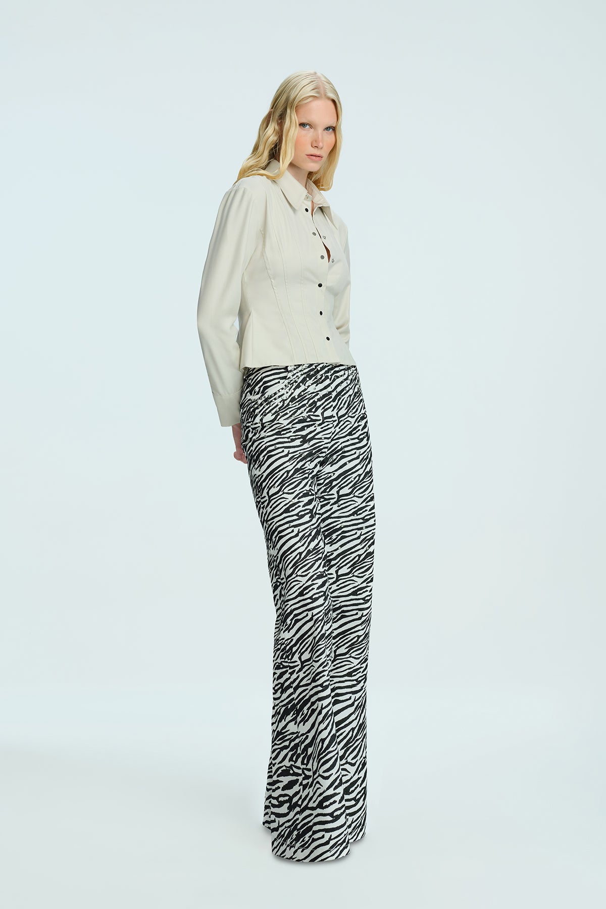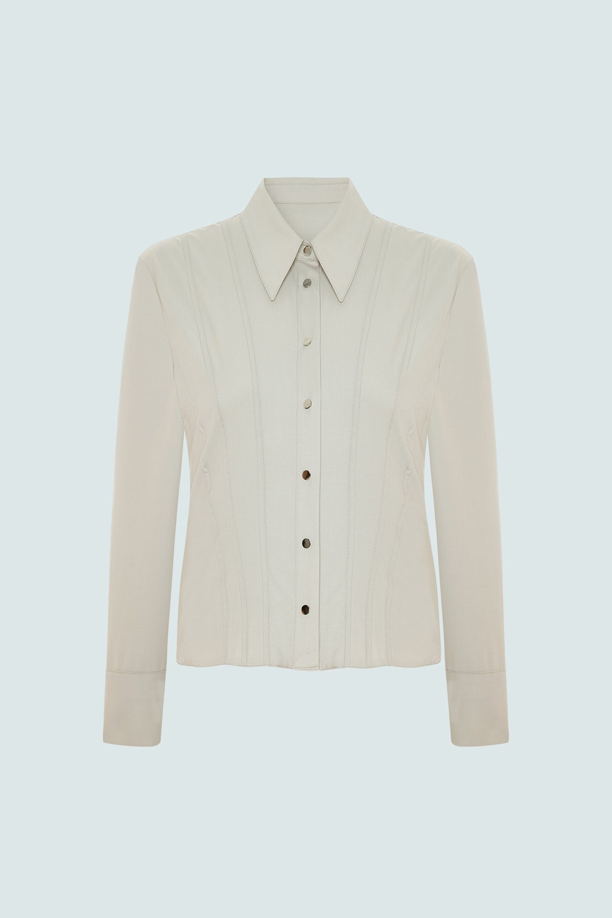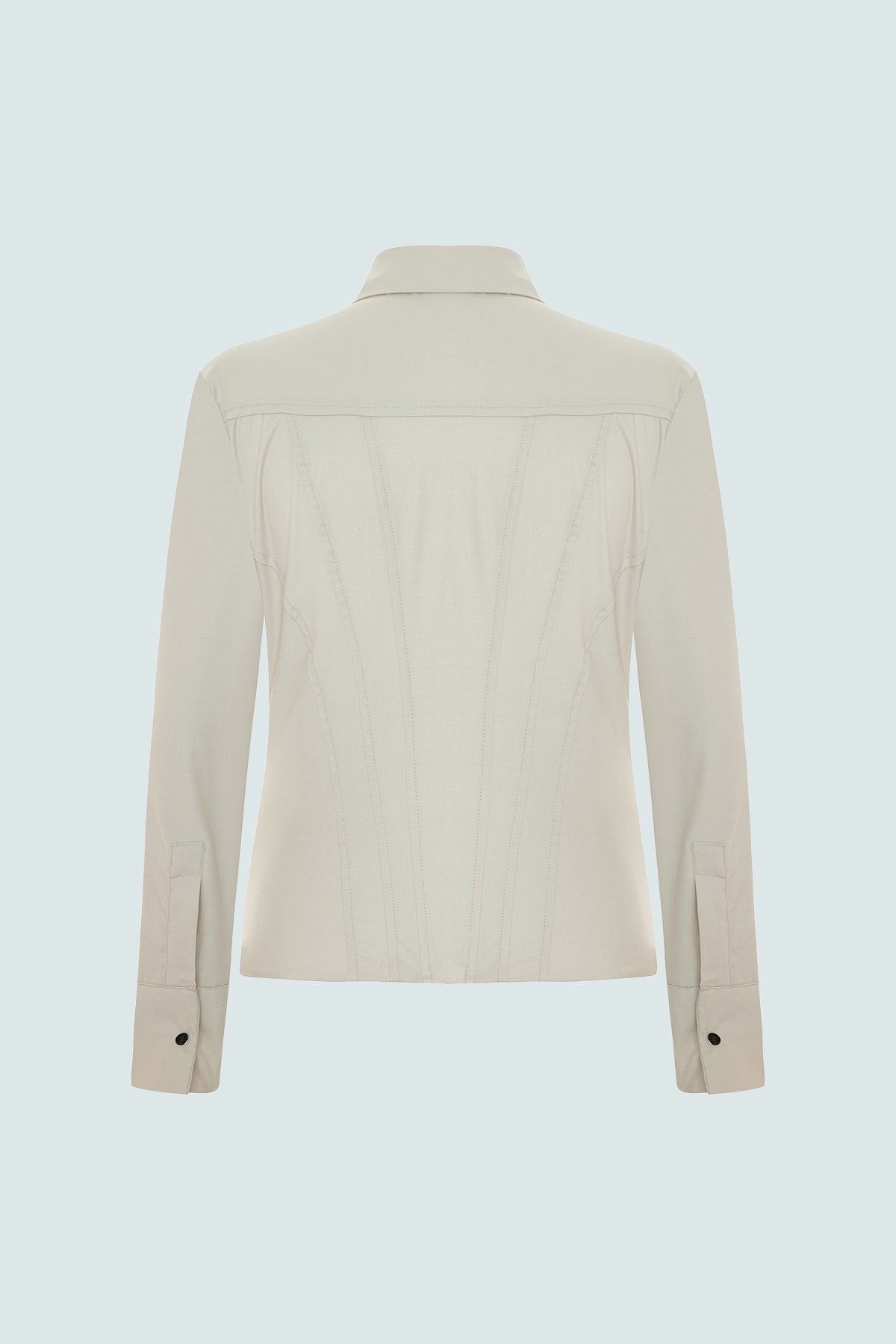 This design adds a modern touch to the classic shirt form, elegantly shaping the body with its bodice stitching details. It stands out as a simple yet powerful statement of everyday style. • Classic collar